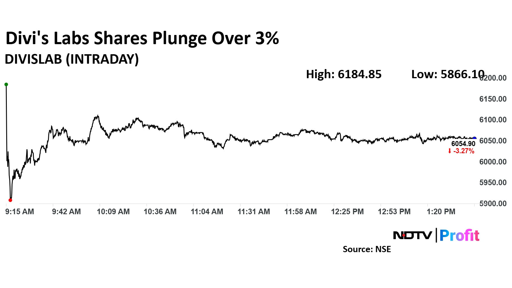 Share price of Divi's Labs stood at Rs 6,052.2 apiece on the National Stock Exchange at 1:48 p.m., down 3.27% as against the previous day's close. In comparison, the benchmark Nifty 50 was up 0.72%.