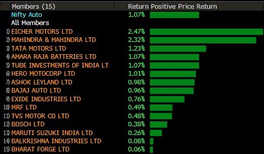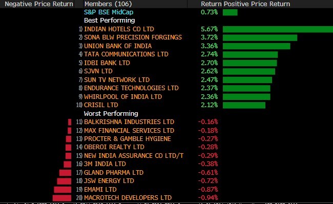 The broader indexes almost mirrored their larger peers with the S&P BSE MidCap index and the S&P BSE SmallCap index adding nearly 1%. All the 19 sectoral indexes compiled by BSE Ltd. advanced, with the S&P BSE Auto, Consumer Durables, Power, Utilities indexes rising over 1%.