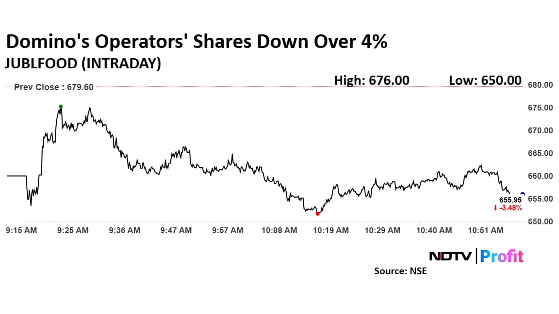 Jubilant FoodWorks' stock fell as much as 4.36% during the day to Rs 650 apiece on the NSE. It was trading 2.77% lower at Rs 660.75 apiece, compared to a 3.97% decline in the benchmark Nifty 50 as of 10:59 a.m.
