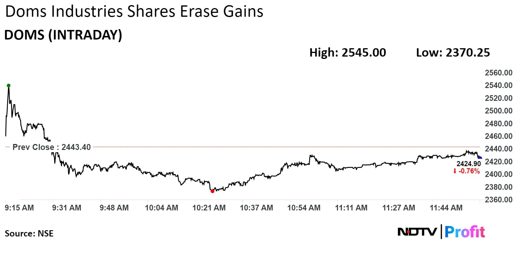 Doms Industries' stock rose as much as 4.16% during the day. It erased gains to trade 0.44% lower at Rs 2,433.1 apiece, compared to a 0.09% advance in the benchmark Nifty 50 as of 11:58 a.m.