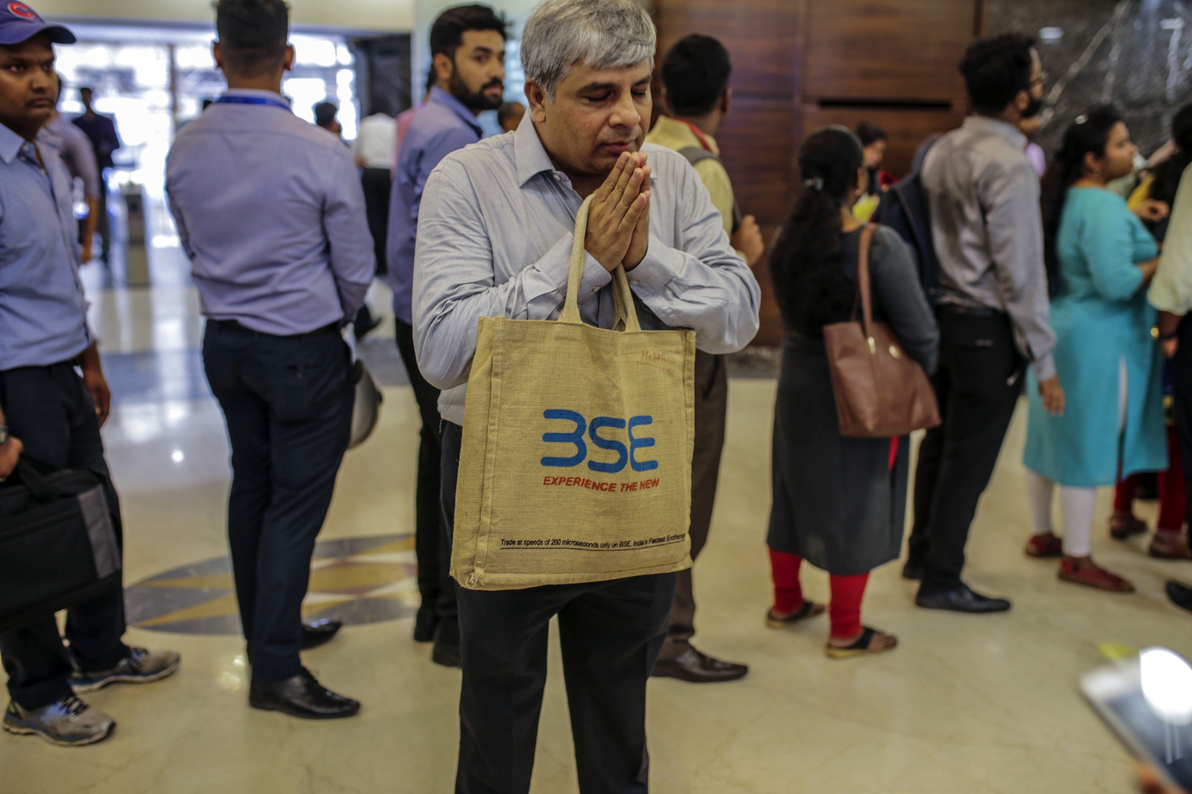 A man prays to a deity on display, not pictured, at the Bombay Stock Exchange (BSE) building in Mumbai, India. (Photographer: Dhiraj Singh/Bloomberg)