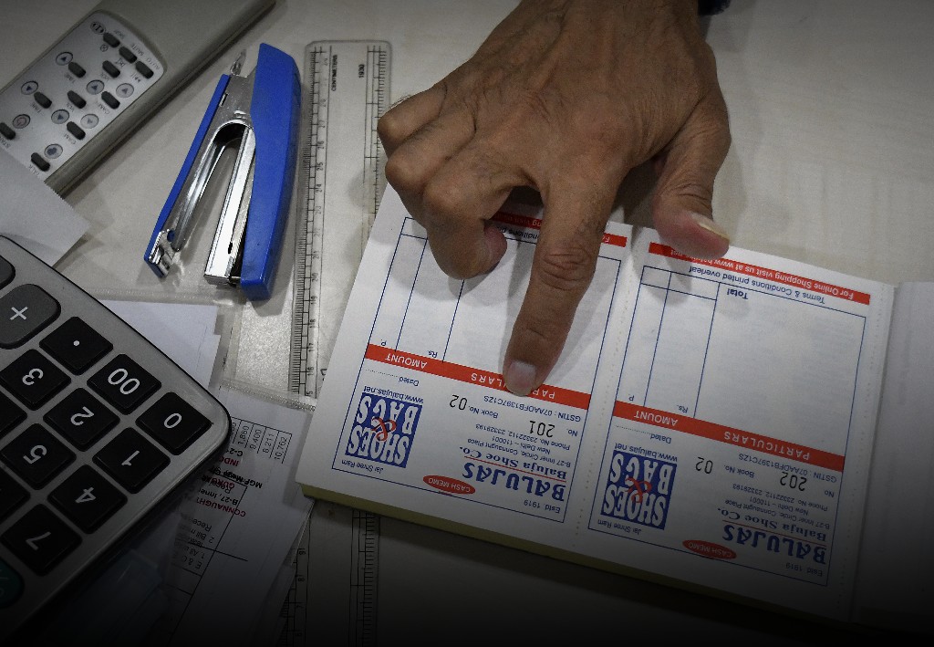 An employee displays a receipt book showing a store’s goods and services tax identification number (GSTIN) in an arranged photograph in New Delhi, India. (Photographer: Anindito Mukherjee/Bloomberg)