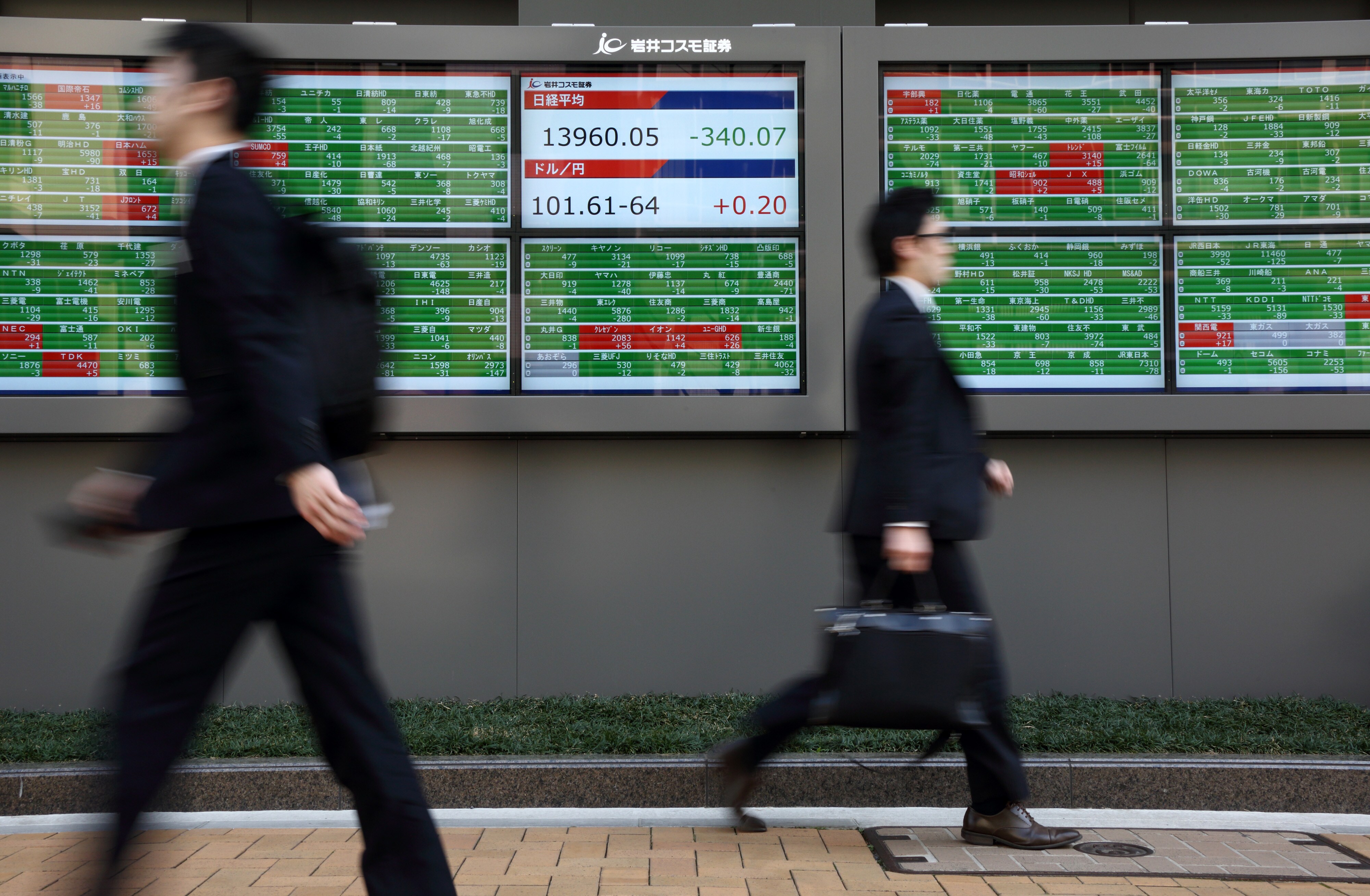 Pedestrians walk past an electronic stock board displaying the closing figure of the Nikkei 225 Stock Average, center top, and the exchange rate of the yen against the U.S. dollar outside a securities firm in Tokyo, Japan. (Photographer: Tomohiro Ohsumi/Bloomberg)