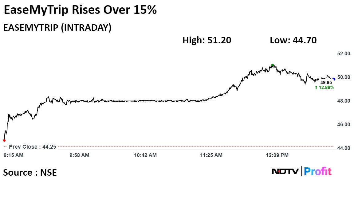 EaseMyTrip's stock rose as much as 15.71%, the highest since March 3, 2023, before paring gains to trade 12.54% higher as of 12:48 p.m. This compares to a 0.22% advance in the NSE Nifty 50.
