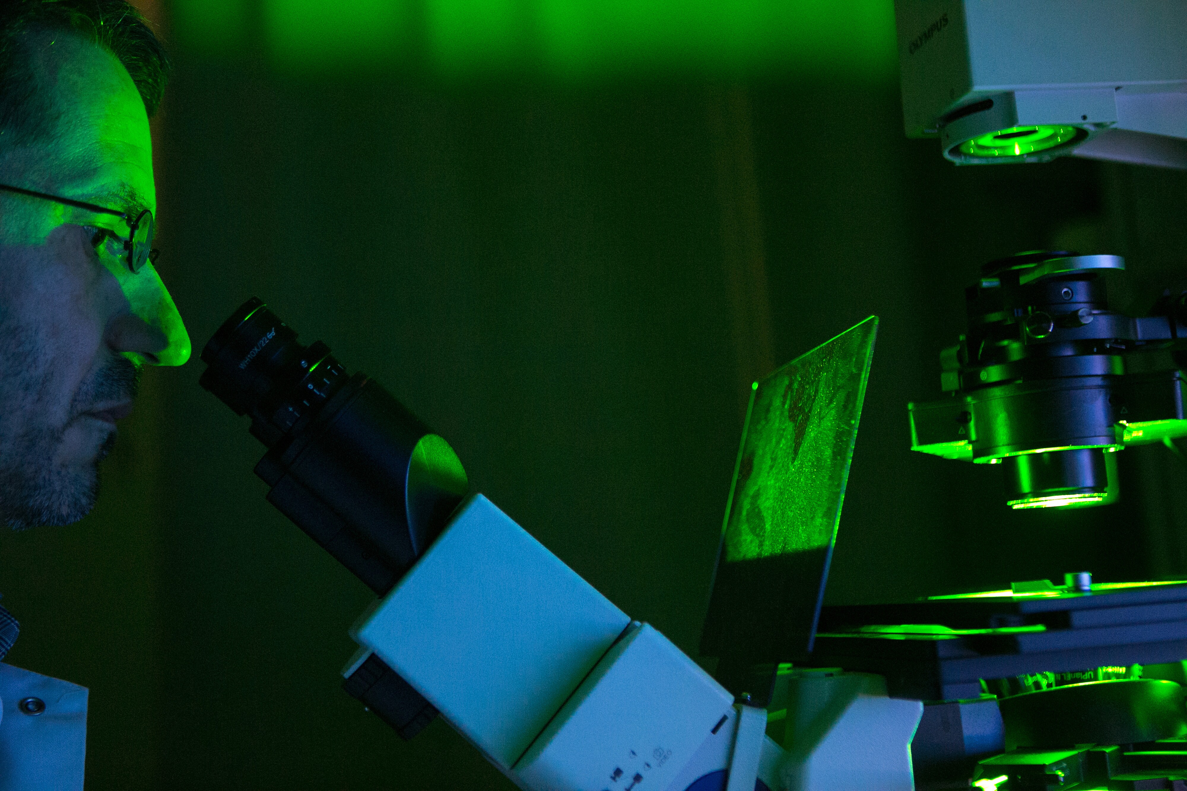 A scientist looks into a microscope inside the laboratory in Hamburg, Germany. (Photographer: Krisztian Bocsi/Bloomberg)