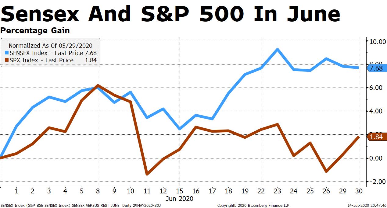 In June, India's stock markets were among the best-performing markets in the world. The BSE Sensex was up nearly 8%.
