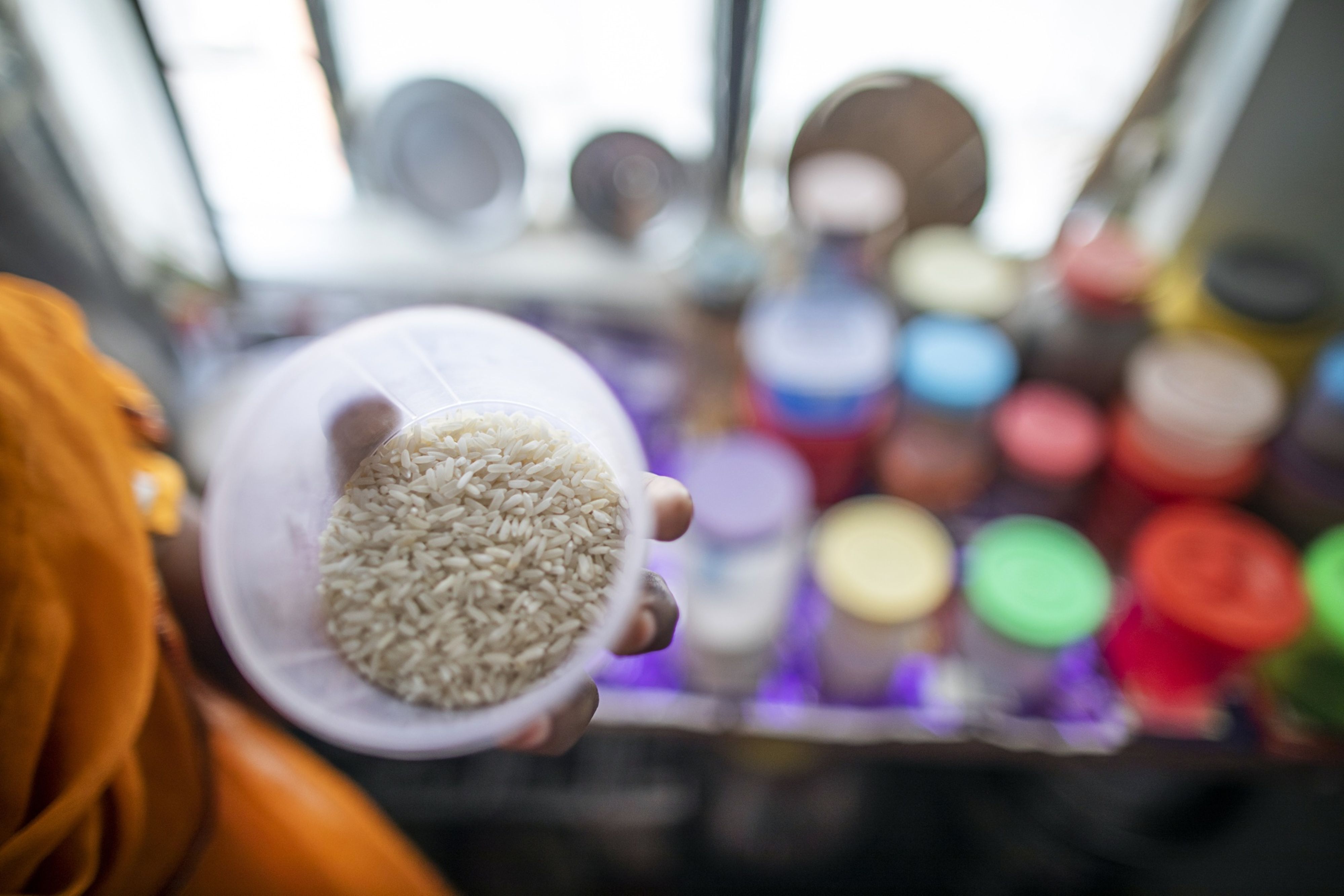 An inhabitant displays a nearly-empty food container in the kitchen of her home at a residential colony, state provided housing, in Banda, Uttar Pradesh, India, on Oct. 12, 2020. (Photographer: Prashanth Vishwanathan/Bloomberg)