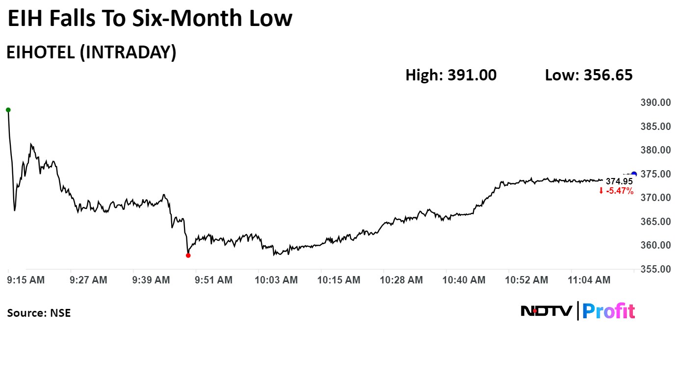 Shares of EIH tumbled 10.08% to Rs 356.65, the lowest level since Feb 6. It pared losses to trade 3.59% lower at Rs 382.40 as of 11:35 a.m., compared to 0.96% advance in the NSE Nifty 50 index.
