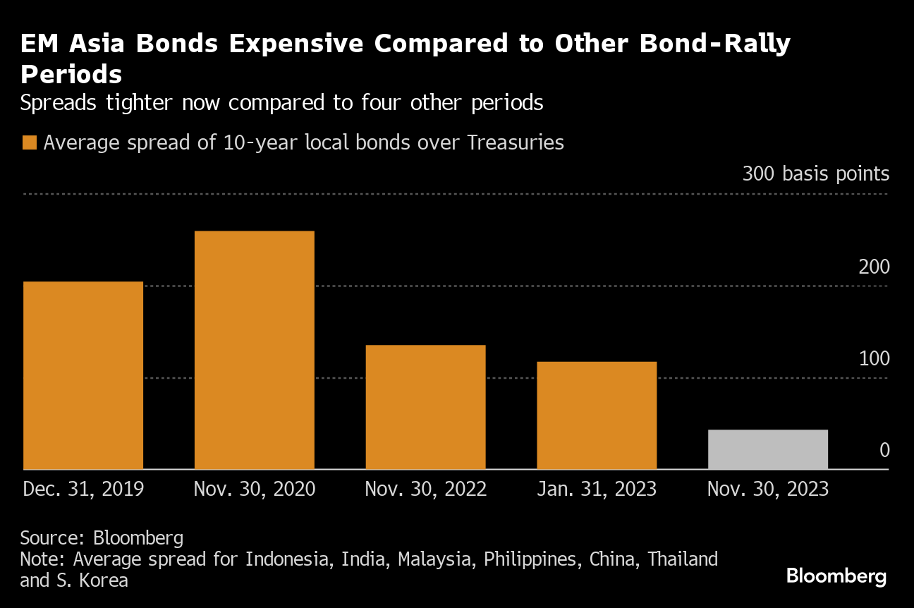 Emerging Asia bond yields fell last month as slowing inflation gave central bankers reason to rethink rate hikes and wagers grew that the Federal Reserve may start to ease next year. Valuations are expensive as the region's 10-year yields offer a tighter premium over similar-dated Treasuries, making them less alluring to global investors despite the Treasury rally in November.