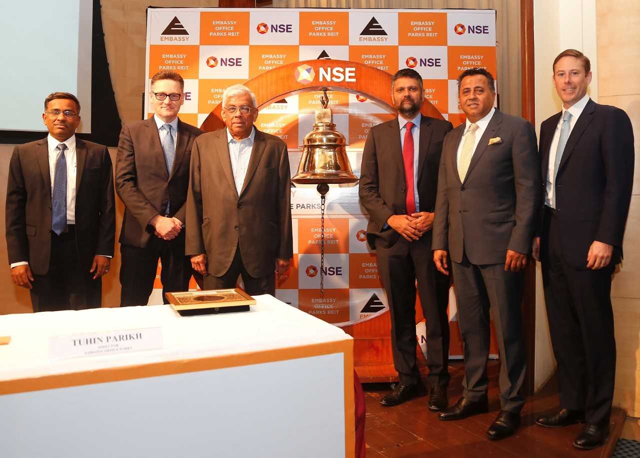 Embassy Office Park, the country's first real estate investment trust, closed 4.7 percent higher than its issue price on stock market debut.
