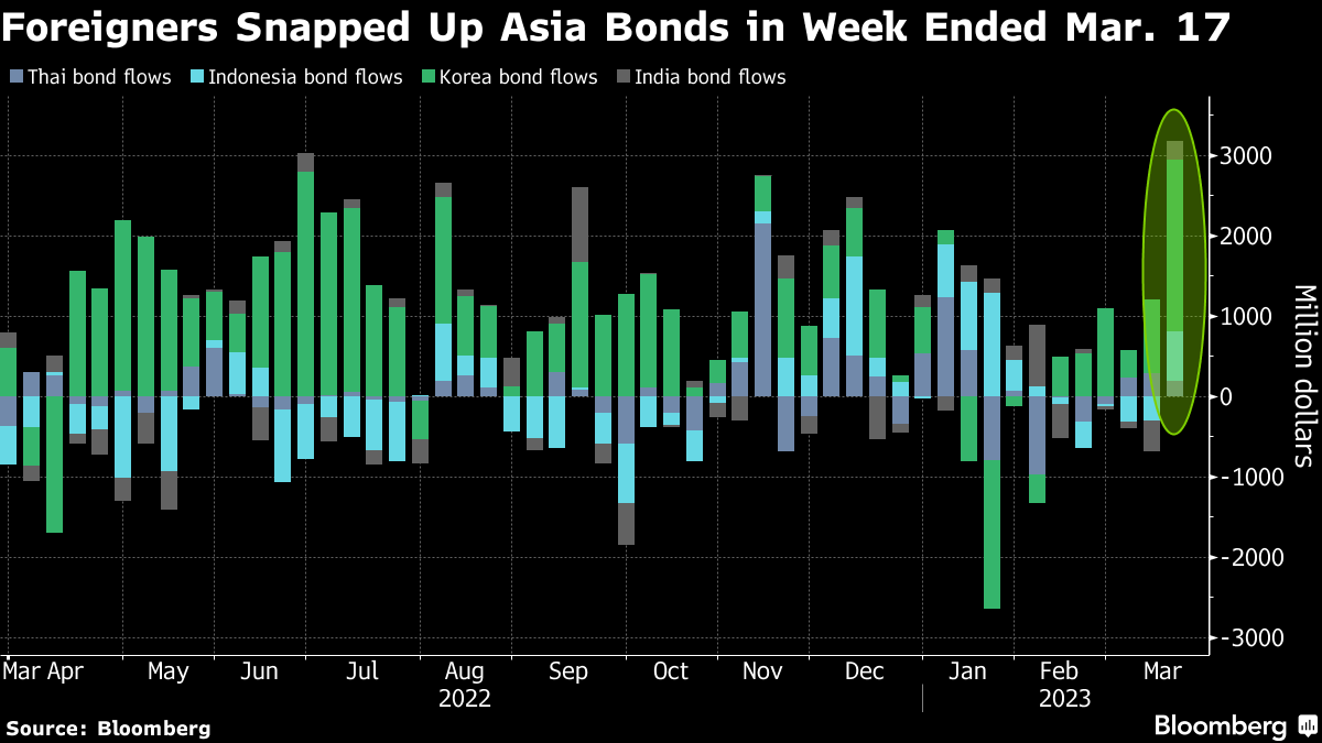 The biggest swings in Treasury yields in more than a decade have sparked a search for alternative havens as investors attempt to weather the fallout from the global banking crisis. Resilient currencies and signs of a peak in inflation may have helped provide ballast for developing Asian bonds amid the turmoil.