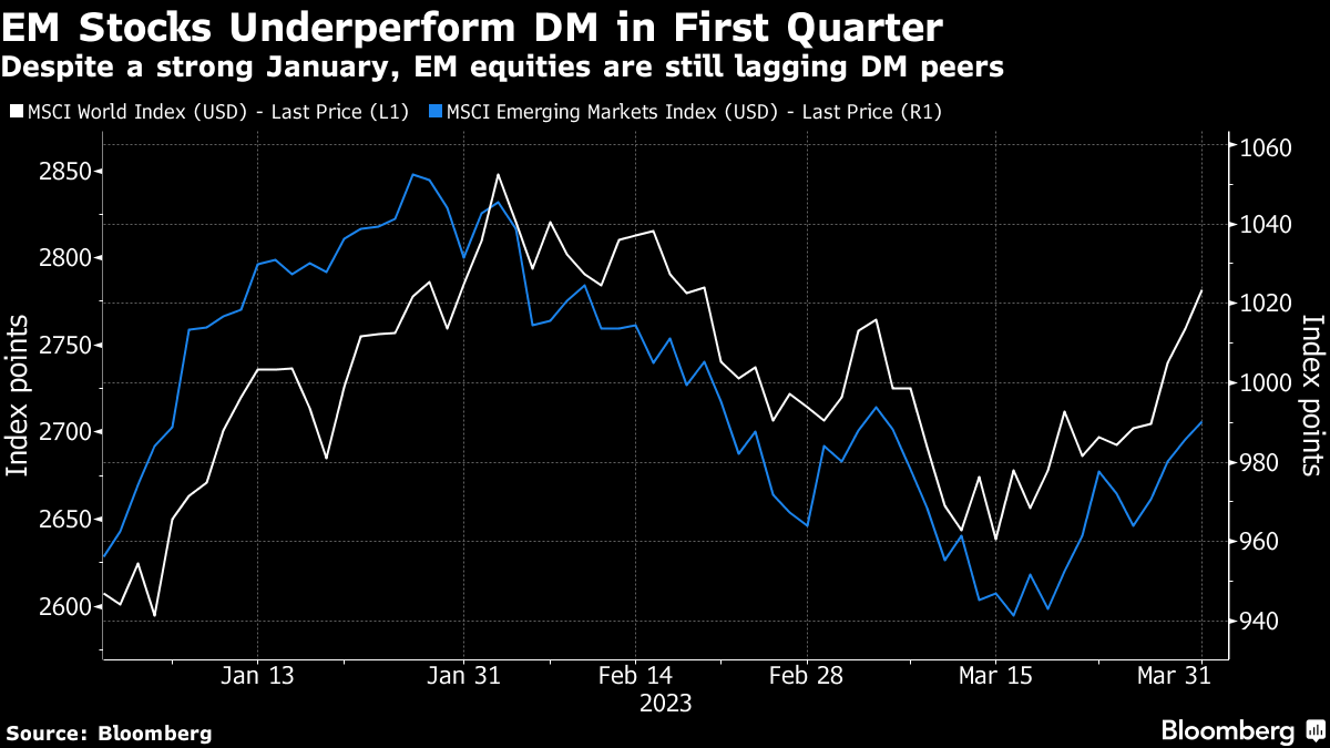 A turn-of-year rally, spurred by odds of a less-aggressive Federal Reserve and Chinese growth, soon turned tenuous as global banking turmoil shook investor confidence. Those jitters caused developing stocks to pare an early gain, ending the quarter up just 3.5% — about half the return of developed-market peers. EM dollar debt gained 1.7%, less than other global fixed-income segments.