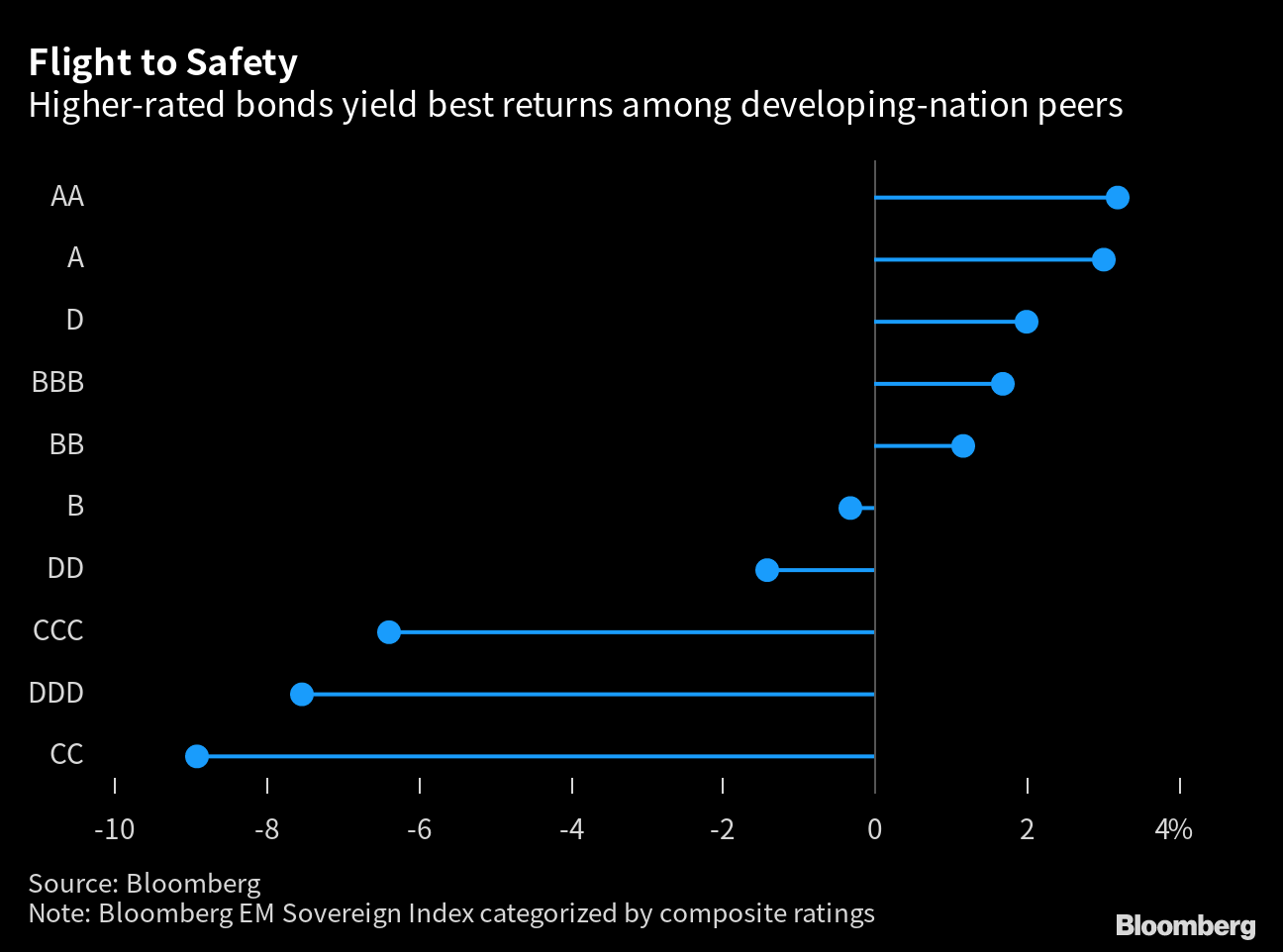 High-yield EM debt suffered from a flight to quality in global markets. The extra yield investors demand to hold speculative-grade sovereign bonds over US Treasuries has widened 62 basis points in the quarter, compared with a 19 basis-point increase for investment-grade bonds, according to JPMorgan Chase & Co. data.