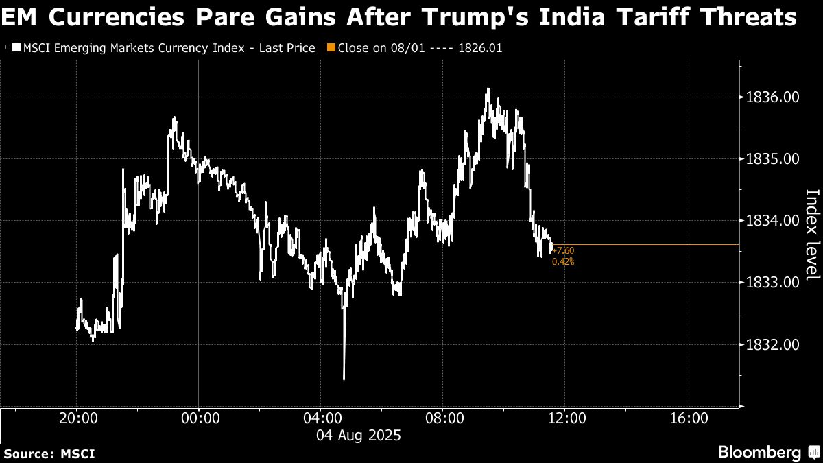 Currencies and stocks in developing economies trimmed gains after US President Donald Trump threatened to hike tariffs on India even above the punitive rate announced last week.