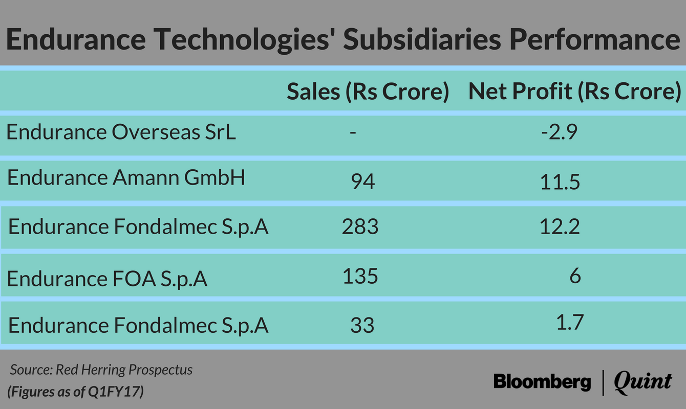 Endurance Technologies has four wholly-owned subsidiaries in Italy and one wholly owned subsidiary in Germany.