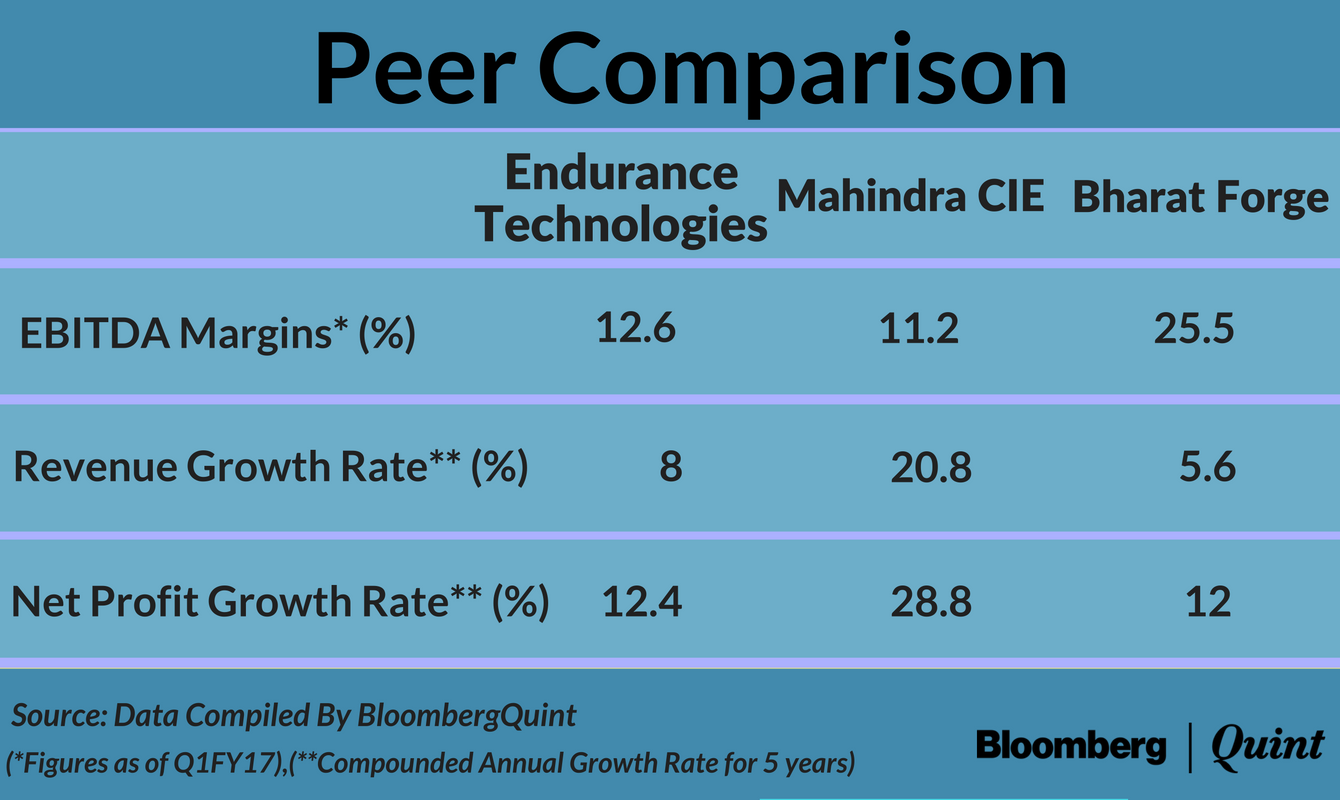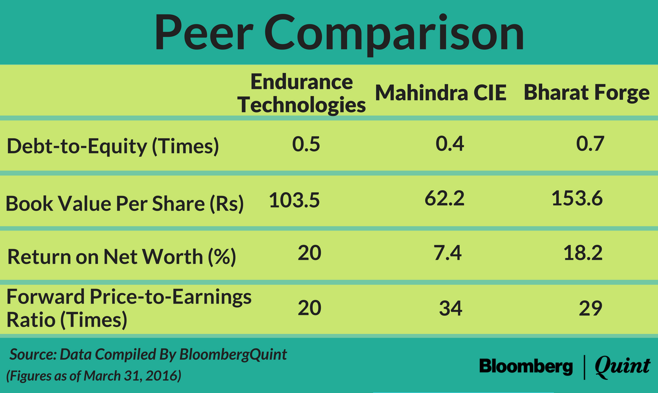 Endurance Technologies' return on networth is better than peers and it will trade at a cheaper forward price-to-earnings (P/E) ratio, according to data compiled by BloombergQuint. The company is likely to trade at a forward P/E of 20 times, while its peers are trading in the range of 29 to 34 times.