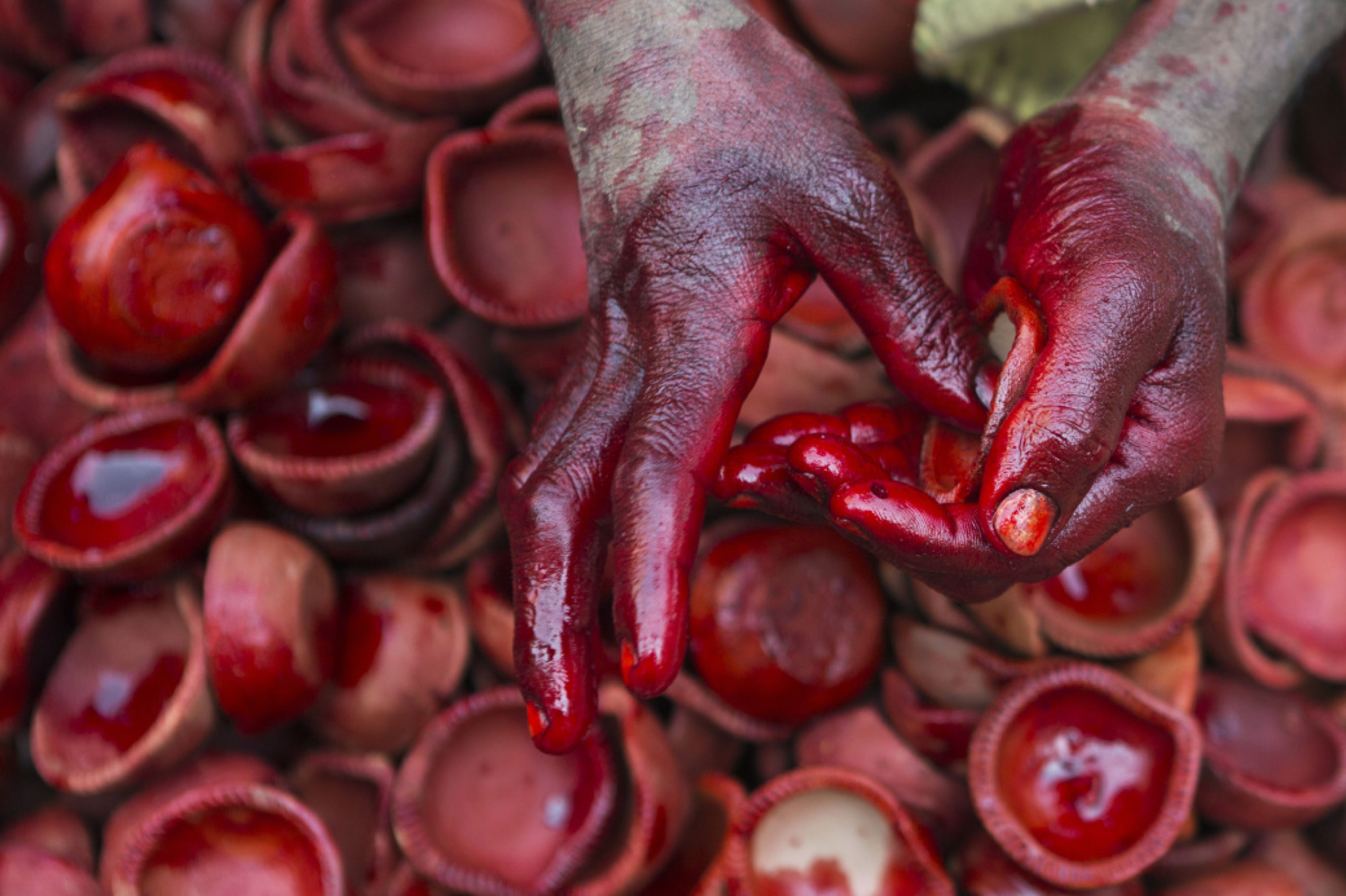 A worker paints Diwali diyas, earthenware lamps, at a pottery workshop in India. (Photographer: Prashanth Vishwanathan/Bloomberg)