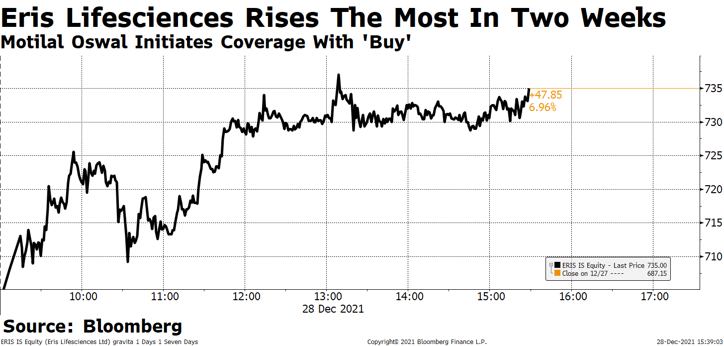 Shares of Eris Lifesciences Ltd. gained after Motilal Oswal initiated coverage on the pharma company with a ‘buy'.