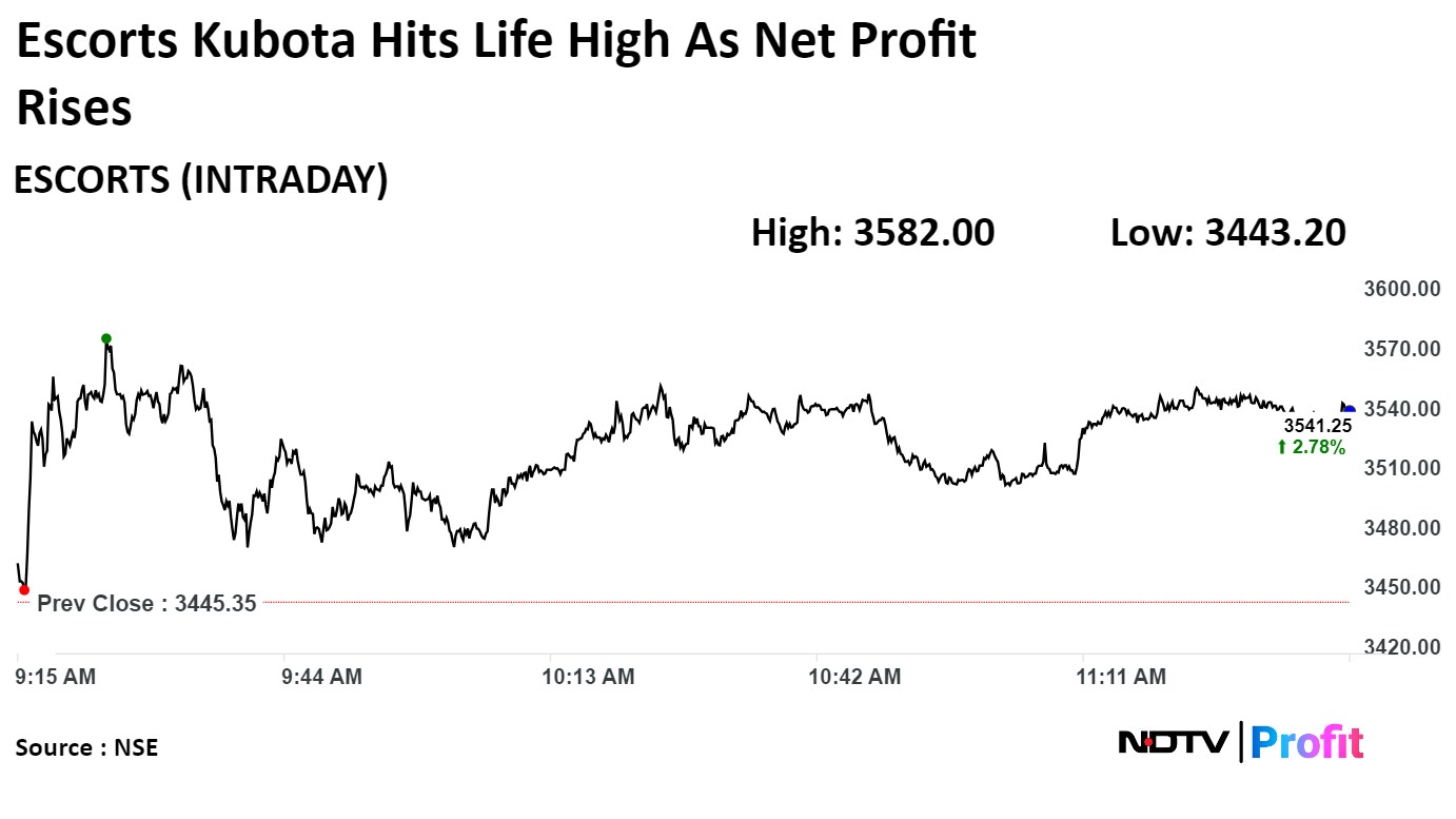 Escorts Kubota Ltd. rose 3.97% to Rs 3,582.00, the highest level since March 1, 1995. It was trading 2.76% higher at Rs 3,540.45 as of 11:41 a.m., as compared to 0.41% advance in the NSE Nifty 50 index.