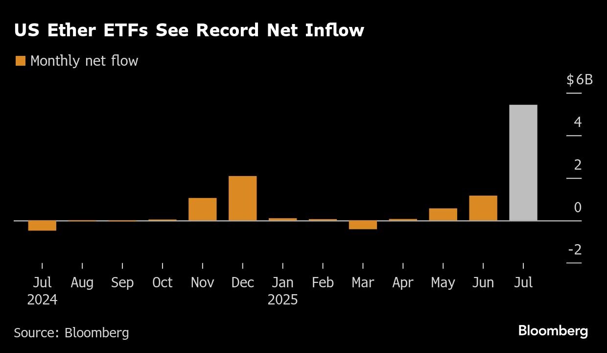 More than $6.7 billion has poured into the nine US-listed Ether spot ETFs year to date. At the same time, Ether-focused “digital-asset treasury firms” — companies that are essentially vehicles for amassing holdings of the toke — have scooped up more than $12 billion worth of the cryptocurrency, based on figures from tracking site strategicethreserve.xyz.