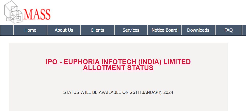 The allotment for the Euphoria Infotech India IPO will be finalised on Friday, January 26, 2024, as per the update available on the website of Mas Services Limited.