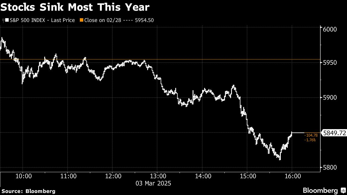 Stocks erased their Friday runup to push the S&P 500 almost 5% below a record high from Feb. 19. The gauge has alternated between gains and losses of at least 1.5% for three sessions, a stretch of violent reversals not seen since March 2020.