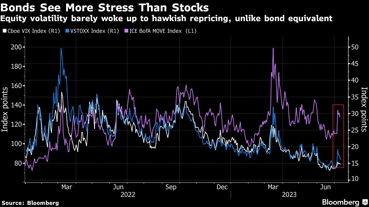 Equity markets are already displaying a degree of calm that reflects investor optimism that inflation is now broadly under control — at odds to the stress seen in bond markets. Still, the outlook for further gains remains clouded after a strong first-half rally, strategists say.