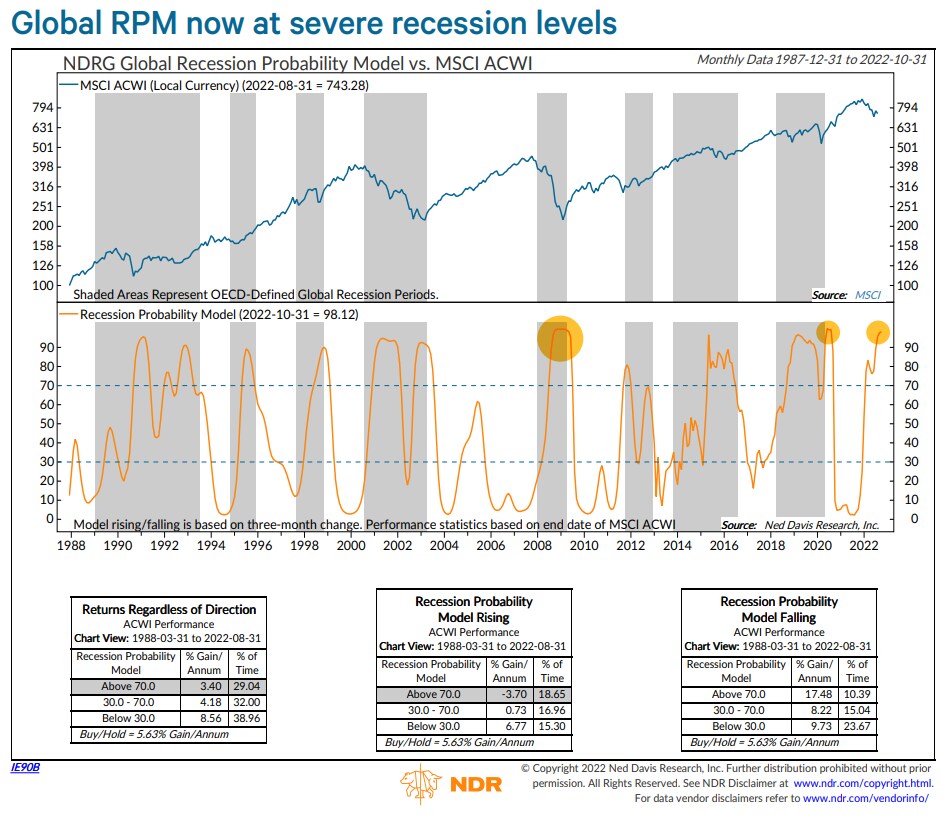 A global recession probability model by Ned Davis Research recently rose above 98%, triggering a “severe” recession signal. The only other times the model's been that high was during previous acute downturns, such as in 2020 and 2008-2009, according to the firm's Alejandra Grindal and Patrick Ayres.