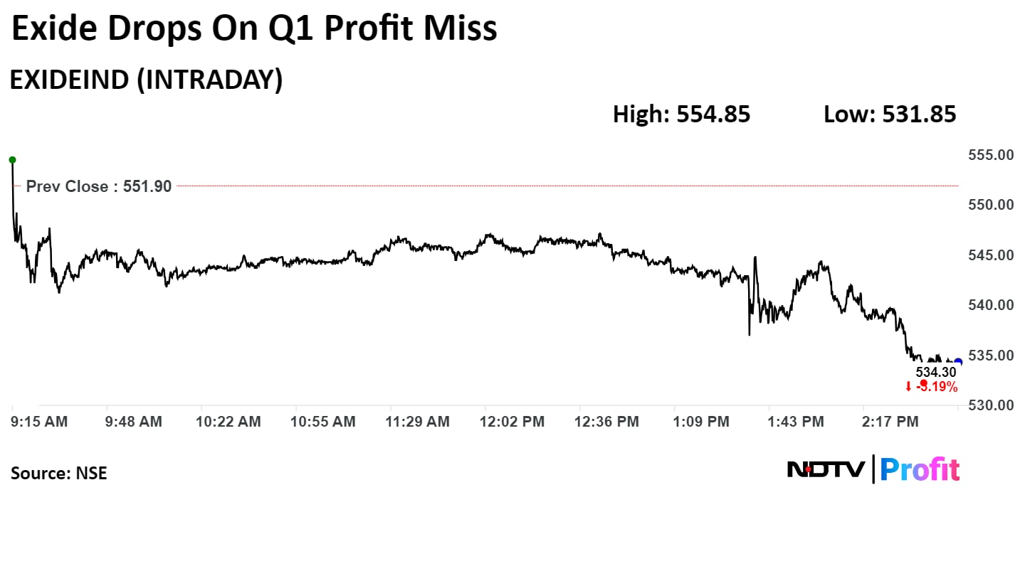 Shares of Exide Industries dropped as much as 3.63% after the results announcement. The counter was trading at 3.24% lower at Rs 543 as of 2:59 p.m., against an advance of 0.31% in the NSE Nifty 50.