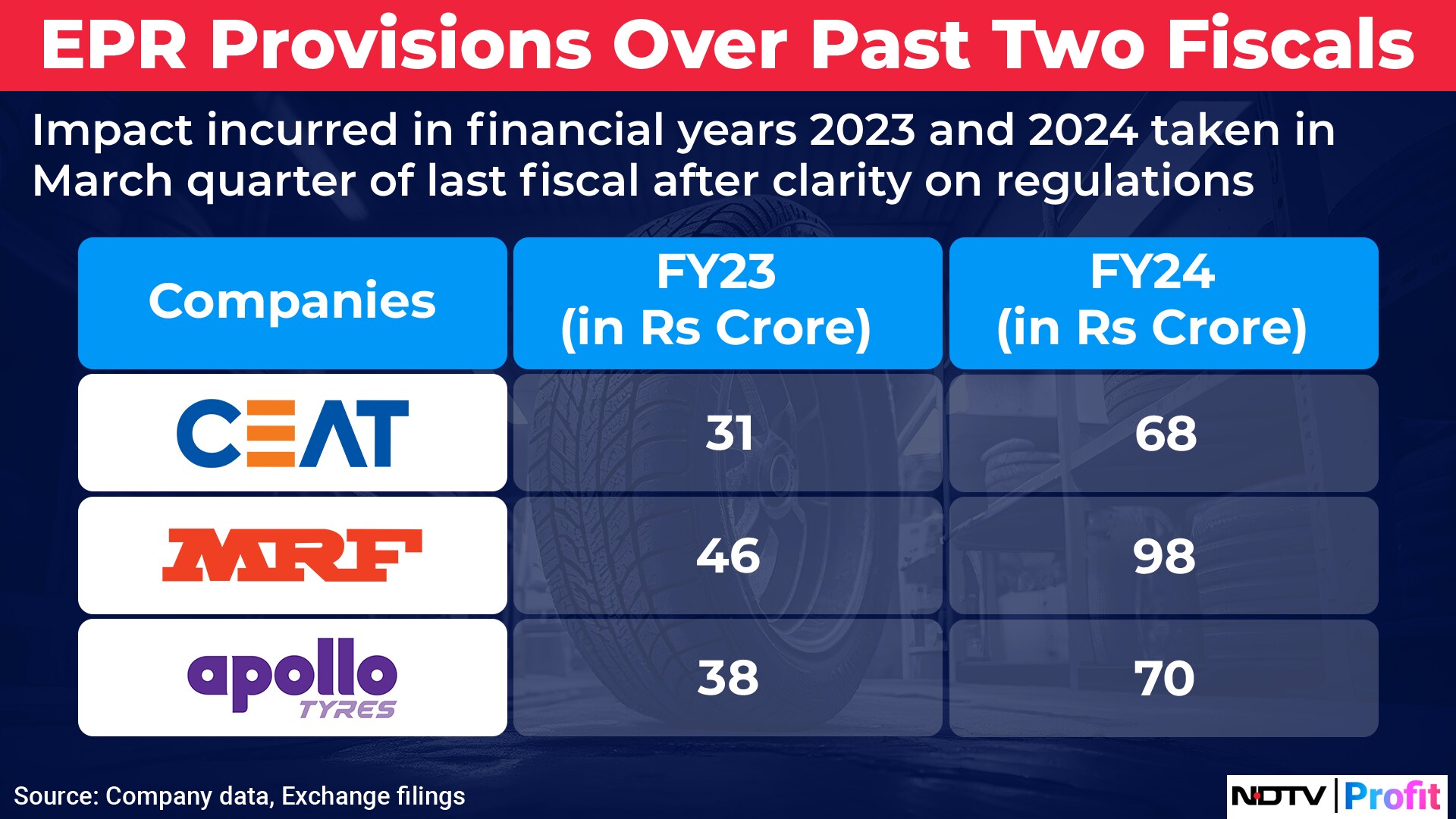 Ceat Ltd. took a total hit of Rs 108 crore for both the fiscals. While, MRF Ltd. has reported roughly Rs 144 crore of provisions for EPR. Apollo Tyres Ltd. reported Rs 99 crore as total provisions for both fiscals.