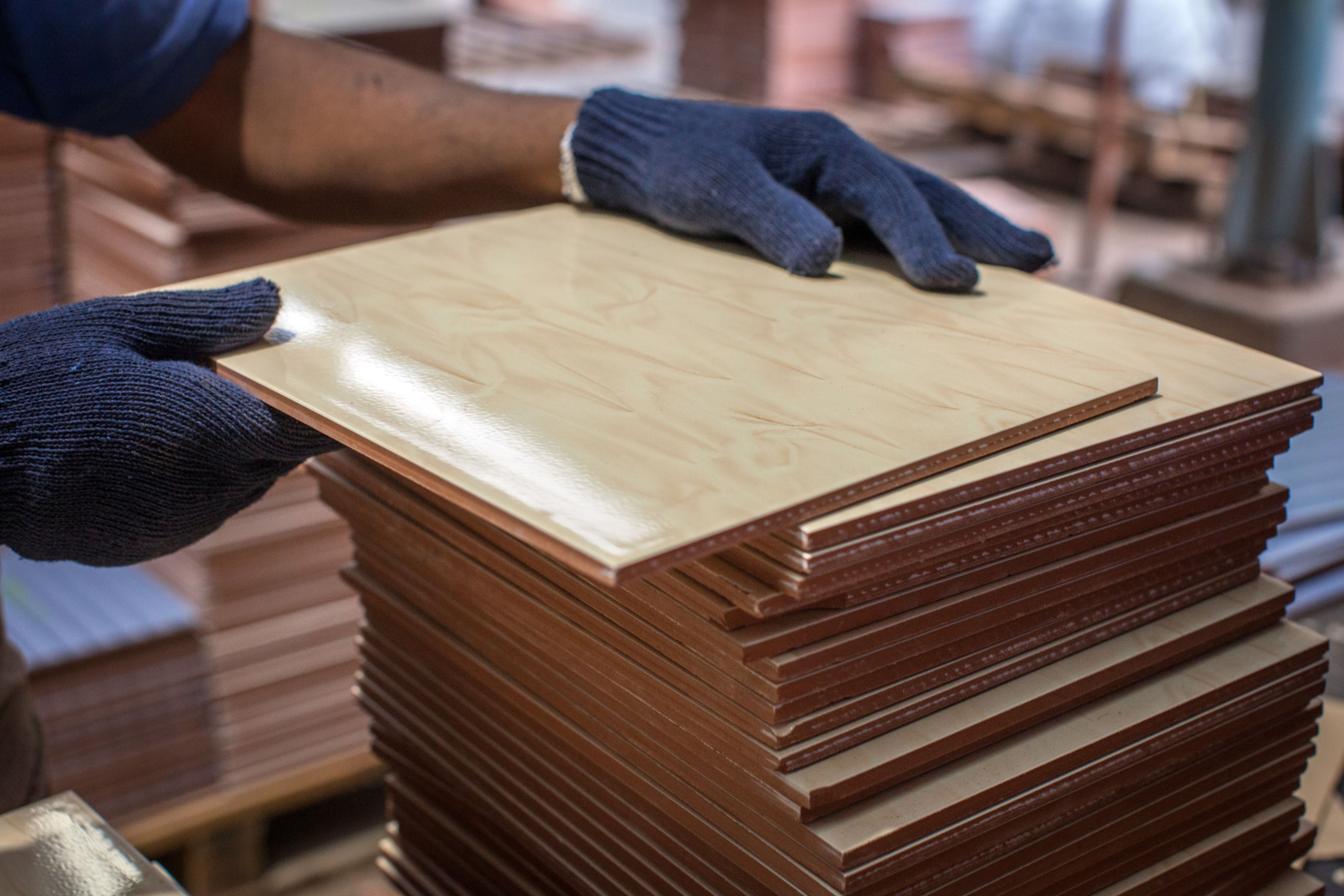 An employee arranges tiles before packing. (Photographer: Asim Hafeez/Bloomberg)