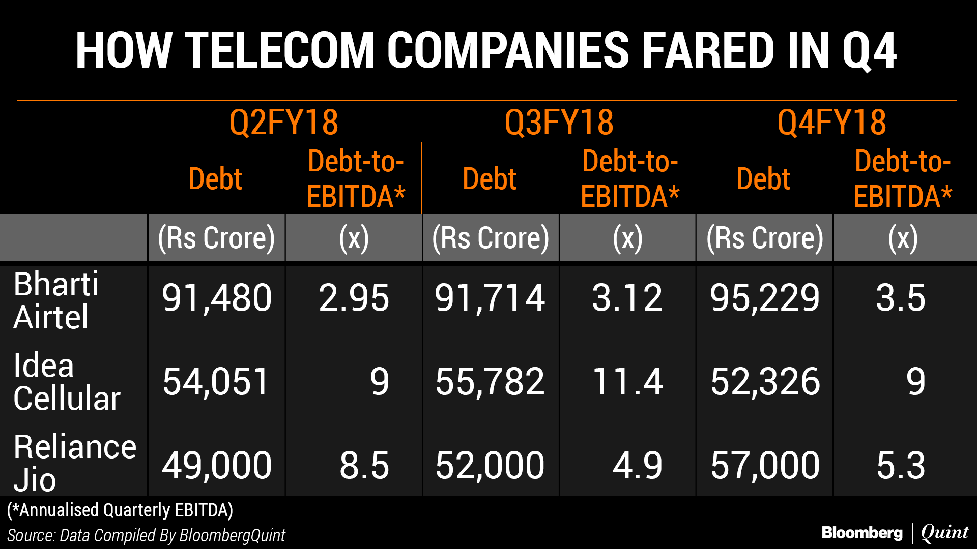 Bharti Airtel, which has the highest debt of close to Rs 95,000 crore on its book, also has the lowest leverage ratio at 3.5 times its Ebidta.