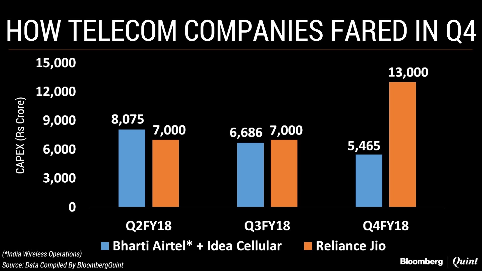 Reliance Jio continues to spend the most to expand its network. Its capital expenditure for the quarter ended March at Rs 13,000 crore was more than twice the combined capex of its two rivals.