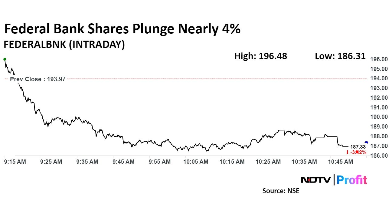 Federal Bank's share price fell as much as 3.80% on Monday to Rs 186.31 apiece on the National Stock Exchange. As of 10:47 a.m., the stock was trading 3.35% lower at Rs 187.08, compared to a 0.36% decline in the benchmark Nifty 50.