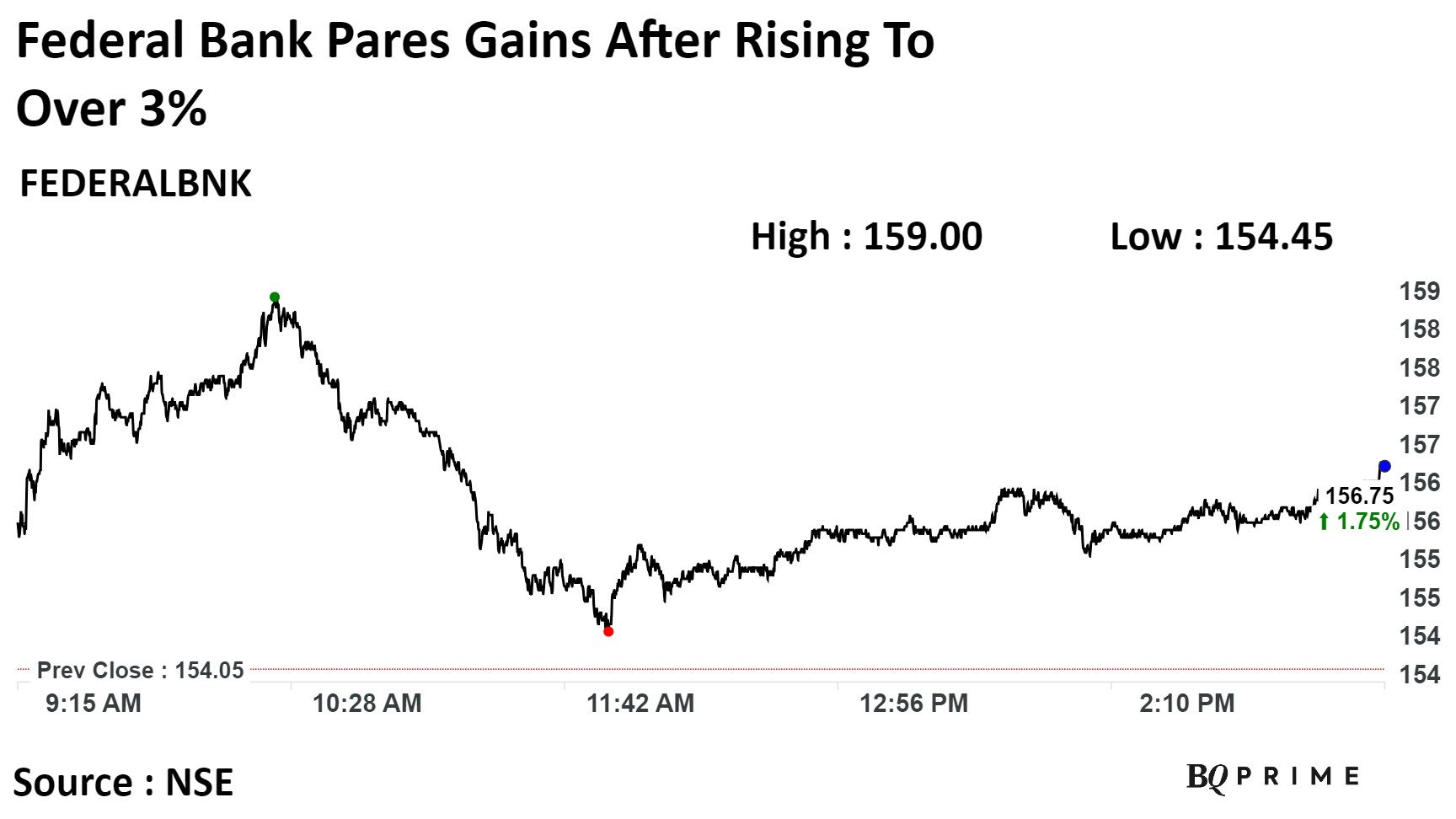The Federal Bank's stock rose as much as 3.25% during the day to Rs 159 apiece on the NSE. It pared gains to close 1.62% higher at Rs 156.55 per share, compared to a 0.81% advance in the benchmark Nifty 50 on Tuesday.