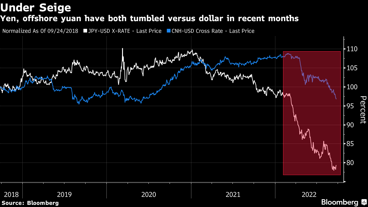 The yuan and yen are both tumbling due to the growing disparity between an uber-hawkish Federal Reserve and dovish policy makers in China and Japan. While other Asian nations are digging deep into foreign-exchange reserves to mitigate the dollar's damage, the yuan and yen's slump is making things worse for everyone, threatening the region's mantle as a preferred destination for risk investors.