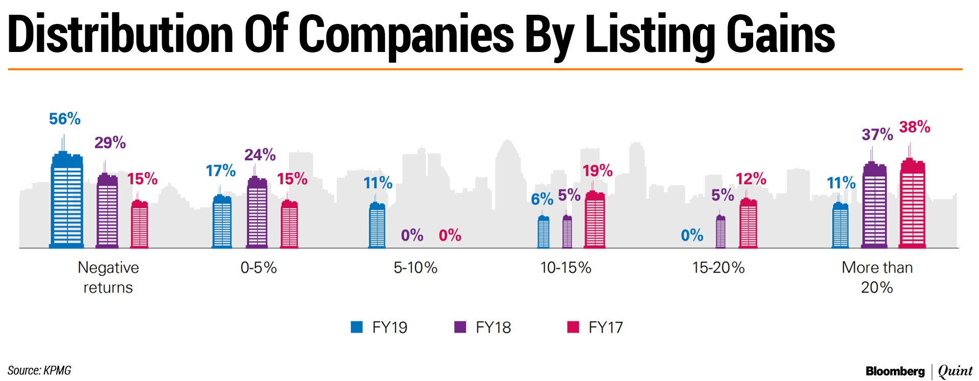 Nearly 56 percent of the companies listed in 2018-19 ended below their offer prices compared to 29 percent and 15 percent in the preceding two financial years, the report said.