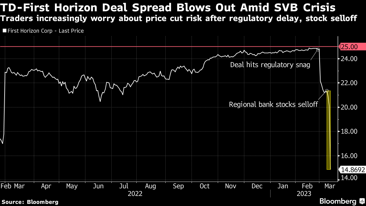 As the fallout spreads from SVB Financial Group's failure, merger-arbitrage traders are rushing to examine which pending deals might be affected. The TD-First Horizon transaction had already been seen at risk because of regulatory delays, even before the collapse of SVB and Signature Bank poisoned investor sentiment for regional banks.