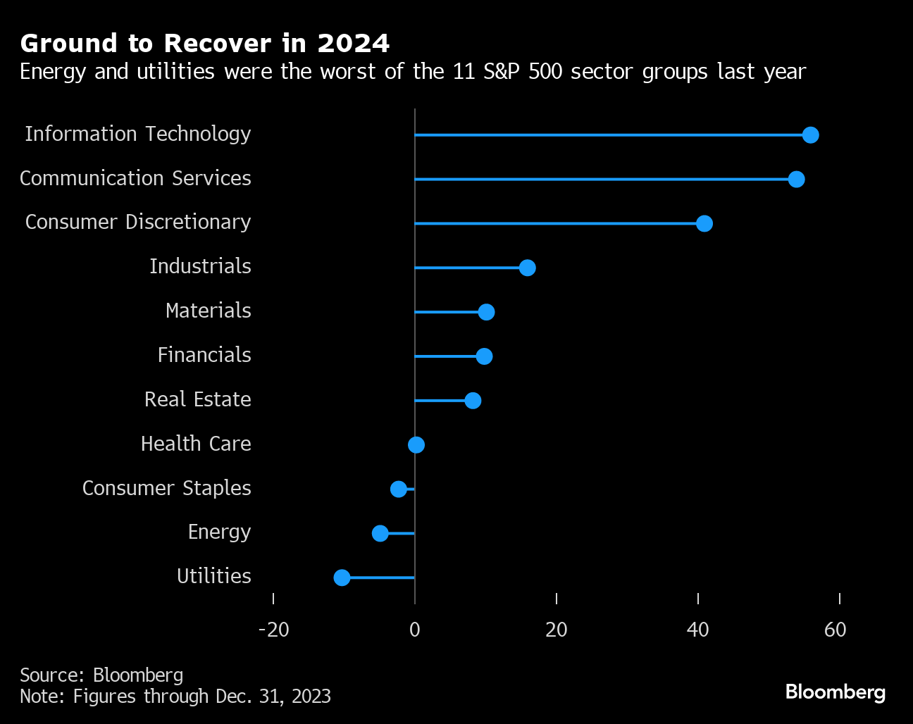 US energy stocks endured a shaky 2023 amid an uncertain supply picture that sent oil prices surging through September before unwinding into year-end as global inventories ballooned. The S&P 500 Energy Index fell 4.8% to rank second-worst among the 11 S&P 500 industry groups. That's a stark reversal of fortune after a blowout performance in the prior year thanks to soaring energy prices and record profits. Going forward, Bloomberg Intelligence sees the potential for a continued selloff for the sector. Utilities — which includes Constellation Energy Corp., Duke Energy Corp., Dominion Energy Inc. and NextEra Energy Inc. — was the worst performer, falling 10%.