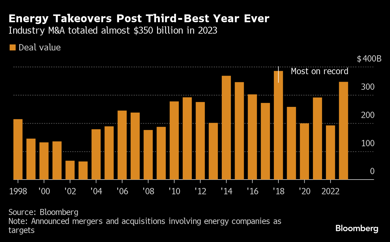 Blockbuster takeovers by Exxon Mobil Corp., Chevron Corp. and Occidental Petroleum Corp. made 2023 a year to remember in the global energy industry. Those deals pushed the total value of announced mergers and acquisitions to $346.2 billion, according to data compiled by Bloomberg. That's 80% more than the prior year, and was only outdone by the value of transactions announced in 2014 and 2018. Last year's dealmaking was driven by oil-and-gas takeovers, with $229.9 billion in announced transactions representing the biggest annual tally for the energy subsector in at least a quarter century. US shale bosses are bracing for more megadeals this year, a quarterly survey by the Federal Reserve Bank of Dallas shows.