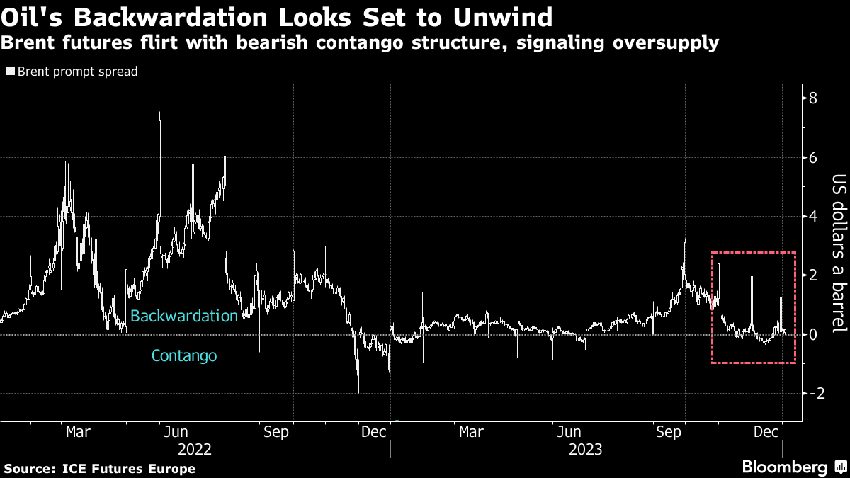 Oil is fresh off its first annual decline since 2020. And while there's no crystal ball to determine what's in store for 2024, one thing is clear: Supply will remain a driving factor. Record production in the US and rising output from non-OPEC+ nations has contributed to a global glut, despite pledges by the Organization of the Petroleum Exporting Countries to curb supplies. Investors are taking note, with Brent's prompt spread once again flirting with contango, a bearish market structure that signals oversupply where barrels for immediate delivery are cheaper than future contracts. UBS Group AG is the latest big bank to cut its forecasts for the global oil benchmark as the cartel's spare production capacity swells, with Brent expected to hold in a $80-a-barrel to $90-a-barrel trading range this year.
