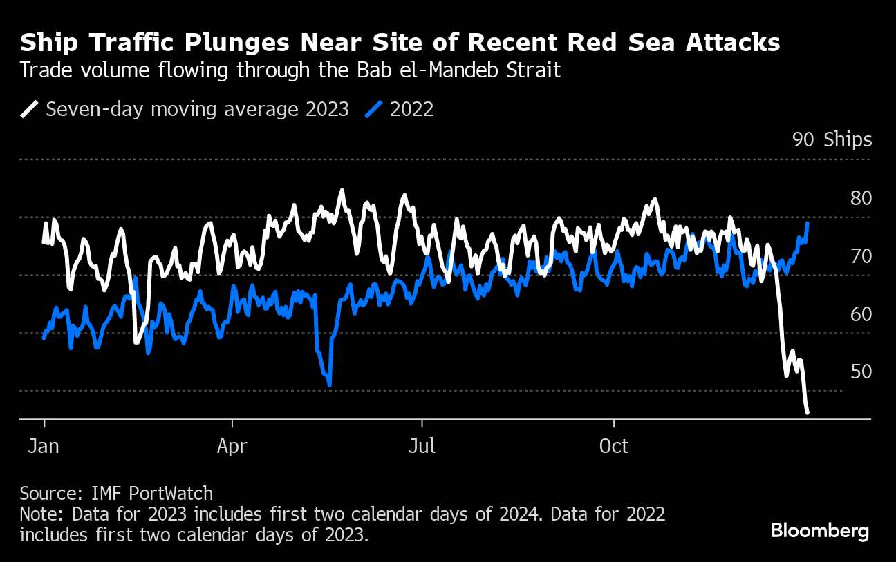 (Bloomberg) -- Welcome to 2024! Extreme weather, economic uncertainty and mounting geopolitical risks from Ukraine and Russia to Israel and the broader Middle East were dominant themes last year, and are poised to remain part of the storylines in the weeks and months ahead. Rising tensions in the Red Sea have disrupted container shipments through the key trading route, raising prospects for more expensive commodities as vessels are forced to embark on longer travel routes. While oil traders largely looked past the conflict in the waning days of 2023, volatility is crawling back in the first trading sessions of January.