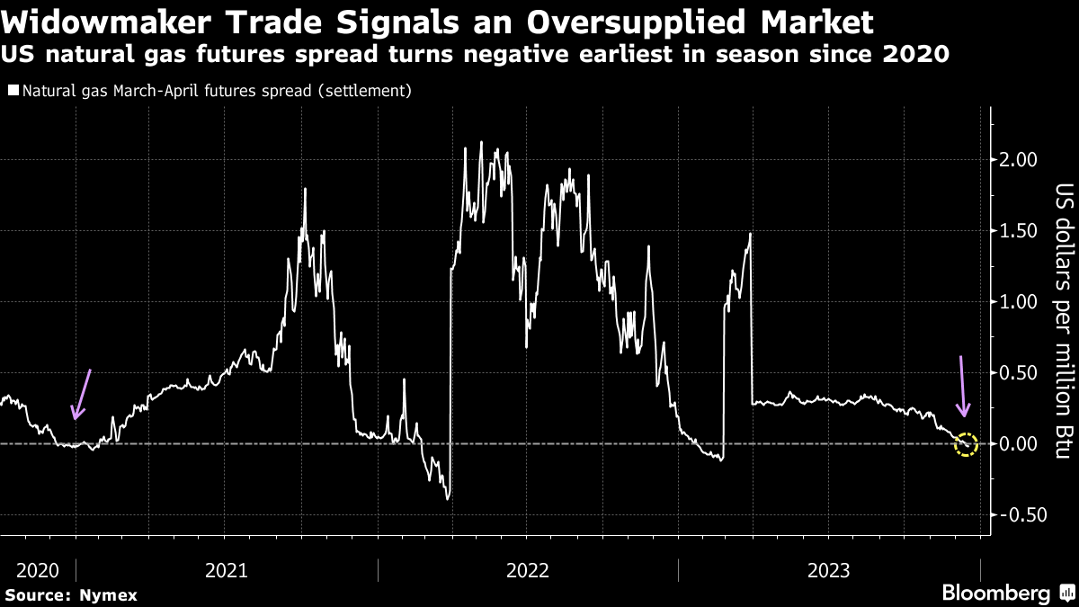 A natural gas trade known as the widowmaker due to its volatility is in focus as unseasonably warm weather in the US reduces demand for the heating and power plant fuel. The spread between March and April futures — essentially a bet on how tight supplies will be at the end of the North American winter — flipped to negative last week. That was the earliest dip below zero in the season on a closing basis since December 2020. In other words, traders drove March futures below gas for delivery the following month, indicating they expect ample end-of-winter supplies amid reduced consumption and as production hits fresh records.