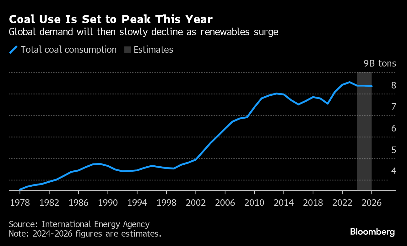 Peak coal is here. Total consumption of the dirtiest fossil fuel will reach a record high of more than 8.5 billion metric tons this year, and then start a long, slow decline, according to the International Energy Agency's Coal 2023 report released Friday. That shift lower will be driven by global efforts to boost clean energy and rein in carbon emissions. Coal remains the world's biggest source of electricity, but surging installations of renewables are outpacing rising demand for power.