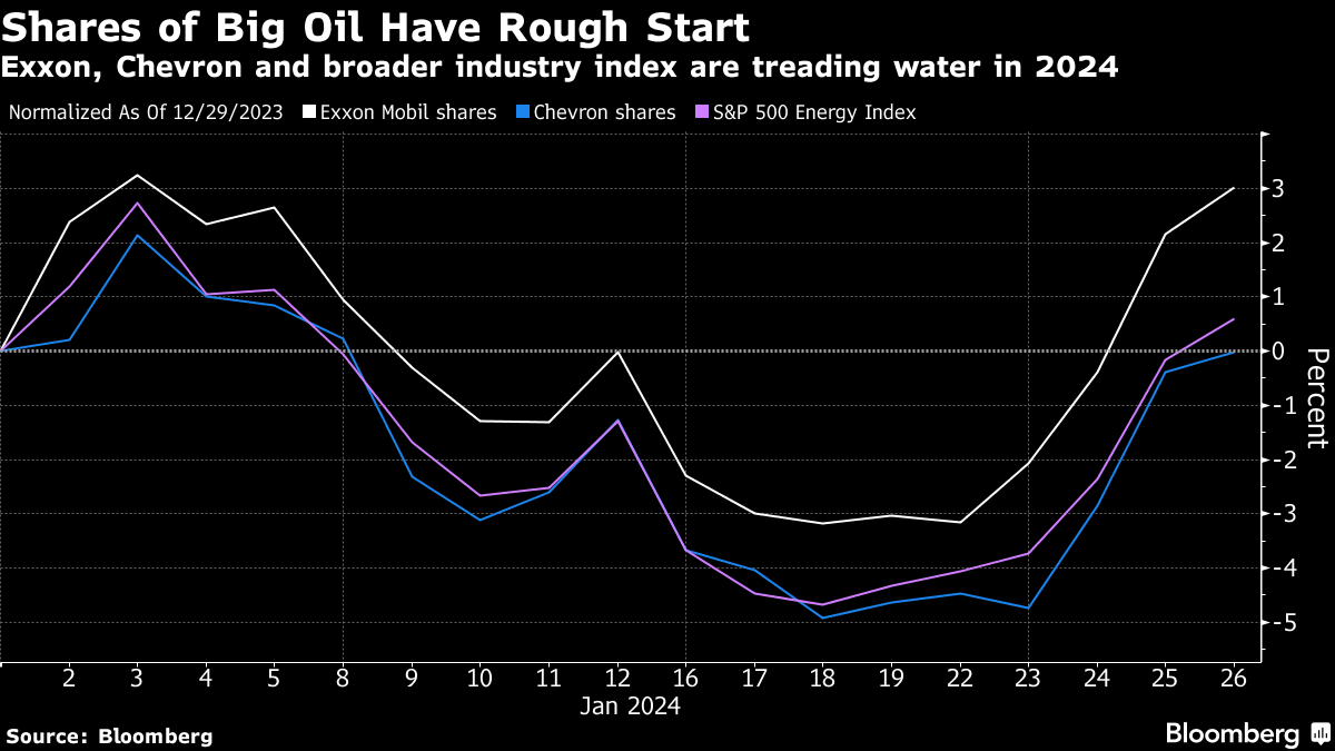 Supermajor peers Exxon and Chevron report fourth-quarter results on Friday. While investors await details of their oil-refining and chemical businesses — which posted disappointing results in the prior period — attention will also be placed on the integration of their blockbuster deals announced last year. The earnings reports come amid a backdrop of ample global supplies, uncertain demand and ongoing risks associated with the Israel-Hamas war. Exxon is one of 11 companies in the 23-member S&P 500 Energy Index to see shares advance this year, while Chevron is little changed.