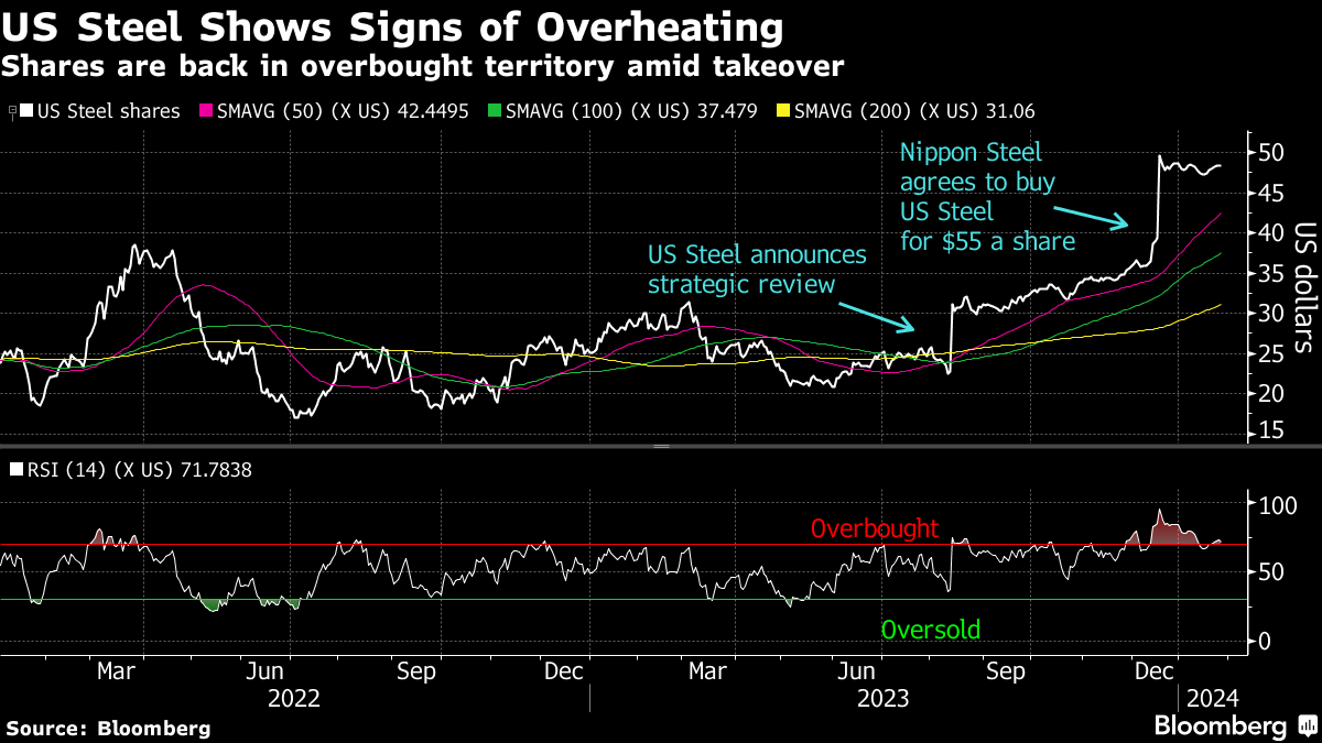 While Nucor, Cleveland-Cliffs and US Steel are reporting earnings this week, all eyes will be on US Steel following the $14.1 billion takeover offer from Nippon Steel Corp. Shares of US Steel have doubled since the iconic steelmaker announced a strategic review in August. The stock is now back above 70 on the 14-day relative strength index, a technical indicator used to identify turning points — signaling the stock may be due for a breather. It's also well above three key moving averages.