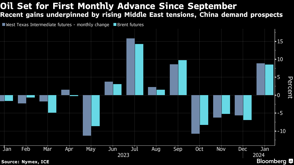 After a lackluster start to the year, oil prices are starting to come to life. West Texas Intermediate and Brent futures are both on track for their first monthly advance in four months thanks to escalating tensions in the Middle East, prospects of demand growth in China amid policymaker efforts to shore up the economy and an unexpectedly large drawdown in US inventories in the most recent reporting period. The OPEC+ Joint Ministerial Monitoring Committee is due to convene online Thursday, although the cartel isn't expected to make any changes to policy, several delegates have said.
