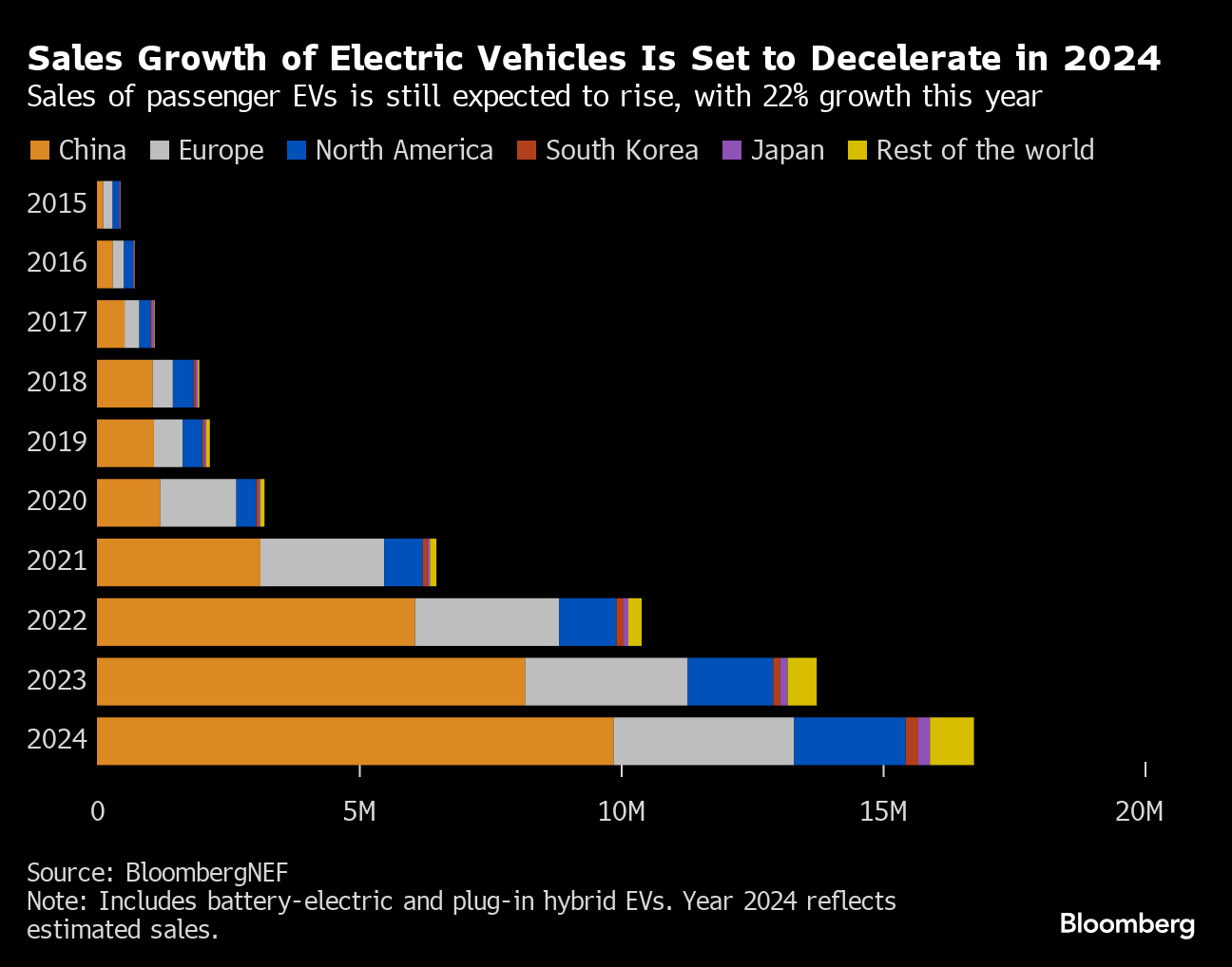 Sales of passenger EVs are facing some speed bumps ahead that could bring a likely slowdown in annual growth rates around the world, according to BloombergNEF's latest report on the industry. A regulatory reshuffle in Europe, market saturation in China and uncertainty in the lead-up to the US presidential election could all take a bite out of consumer confidence. Still, BNEF estimates that annual EV sales this year could climb 22% to 16.7 million passenger EVs globally — a deceleration from last year's 30% jump.