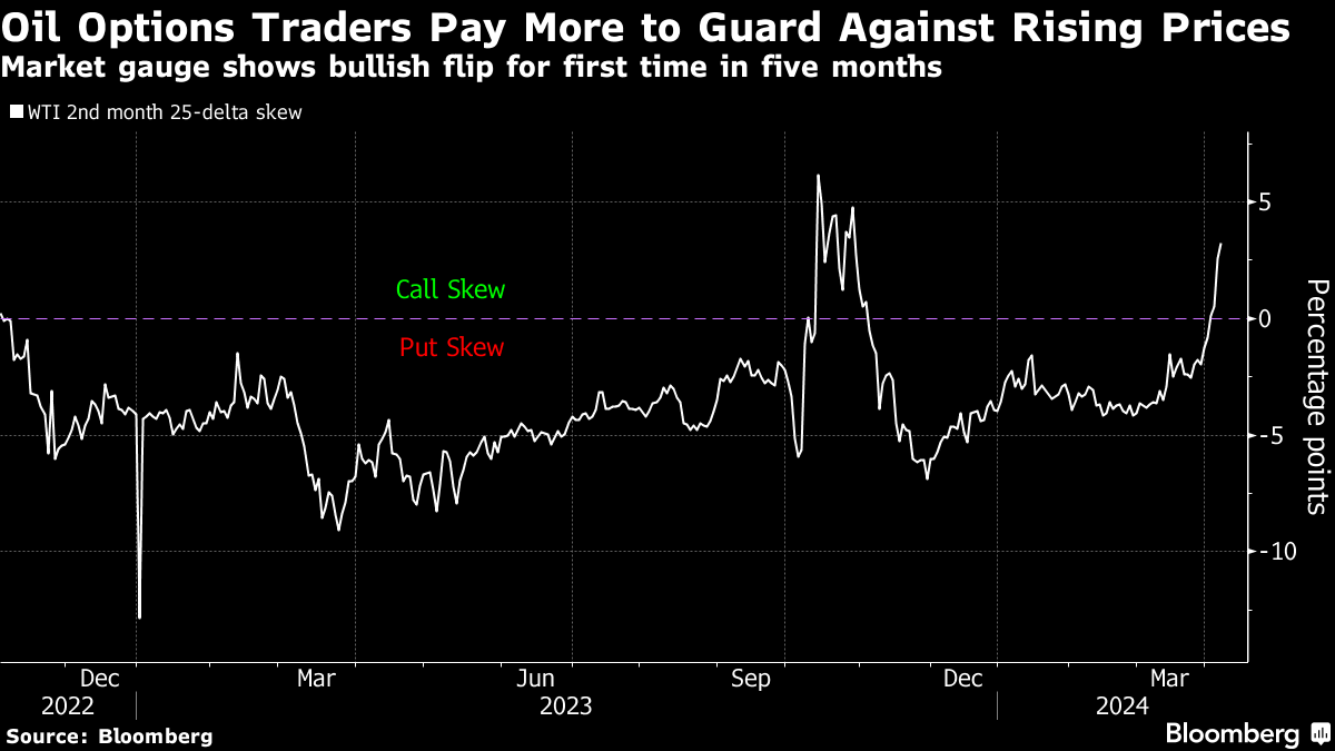 For the first time since November, oil options traders are paying more to hedge against rising crude costs. The gauge known as the so-called skew is showing demand for bullish call options than bearish puts. The market's flip to the call skew underscores the magnitude of bullish sentiment for crude, amid heightened geopolitical tensions. The global benchmark Brent rose above $90 a barrel for the first time since October last week, while West Texas Intermediate has also surged to levels not seen in nearly six months.