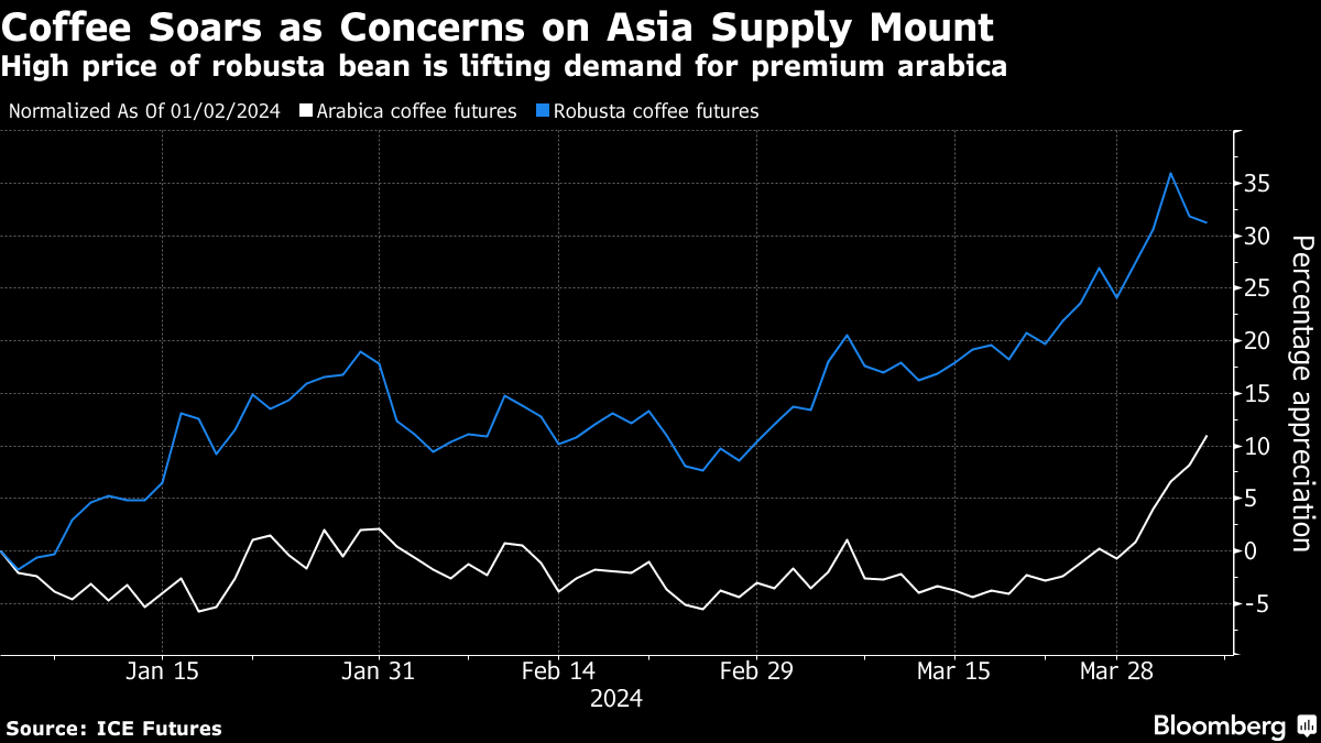 Coffee is soaring, with both the cheaper robusta beans and the premium arabica variety on a tear. Robusta futures are trading near record highs as a heat wave threatens production in top exporter Vietnam, adding to concerns over tight global supplies of the beans used in instant coffee. Arabica — the type favored by Starbucks Corp. — is at its highest in 17 months, as roasters eye the bean as a robusta substitute in blends. The market may get signs of whether relief is in sight from Brazil — the No. 1 arabica supplier — when industry group Cecafé releases monthly export data later this week.